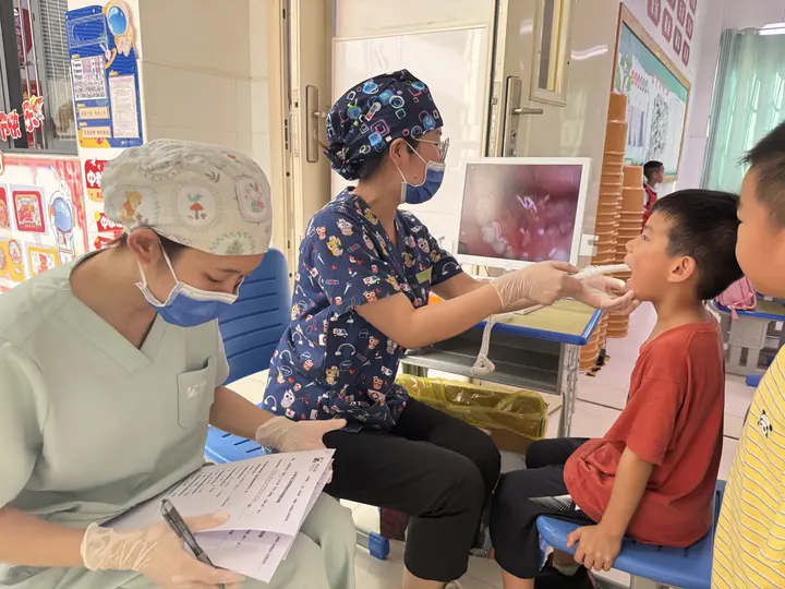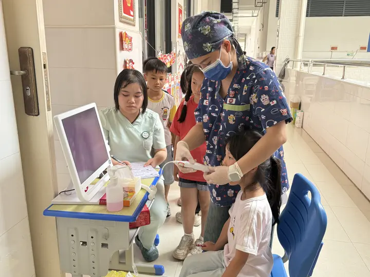除趣味宣教外,南宁完氏口腔医护人员还携带移动口窥仪等专业设备,在南宁市月湾路小学开展现场口腔筛查,为该校一年级三百余名适龄儿童提供“一对一” 检查。筛查中,医护人员重点查看孩子口腔牙齿清洁度、是否有适合做窝沟封闭的牙齿及是否存在蛀牙等问题。